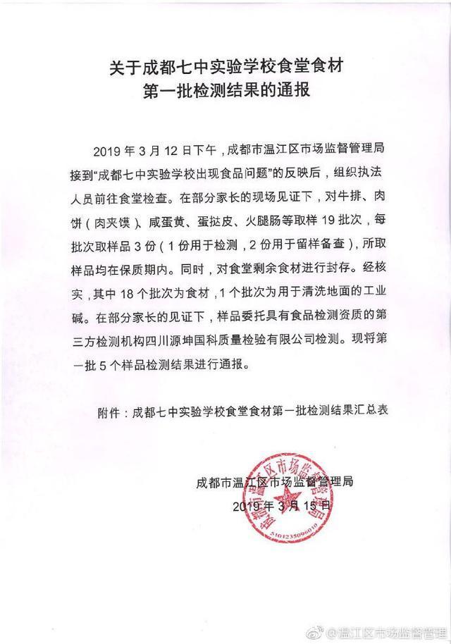 據(jù)通報,2019年3月12日下午,成都市溫江區(qū)市場監(jiān)督管理局接到“成都七中實驗學(xué)校出現(xiàn)食品問題”的反映后,組織執(zhí)法人員前往食堂檢查。在部分家長的現(xiàn)場見證下,對牛排、肉餅(肉夾饃)、咸蛋黃、蛋撻皮、火腿腸等取樣19批次,每批次取樣品3份(1份用于檢測,2份用于留樣備查),所取樣品均在保質(zhì)期內(nèi)。同時,對食堂剩余食材進行封存。經(jīng)核實,其中18個批次為食材,1個批次為用于清洗地面的工業(yè)堿。在部分家長的見證下,樣品委托具有食品檢測資質(zhì)的第三方檢測機構(gòu)四川源坤國科質(zhì)量檢驗有限公司檢測?,F(xiàn)將第一批5個樣品檢測結(jié)果進行通報。