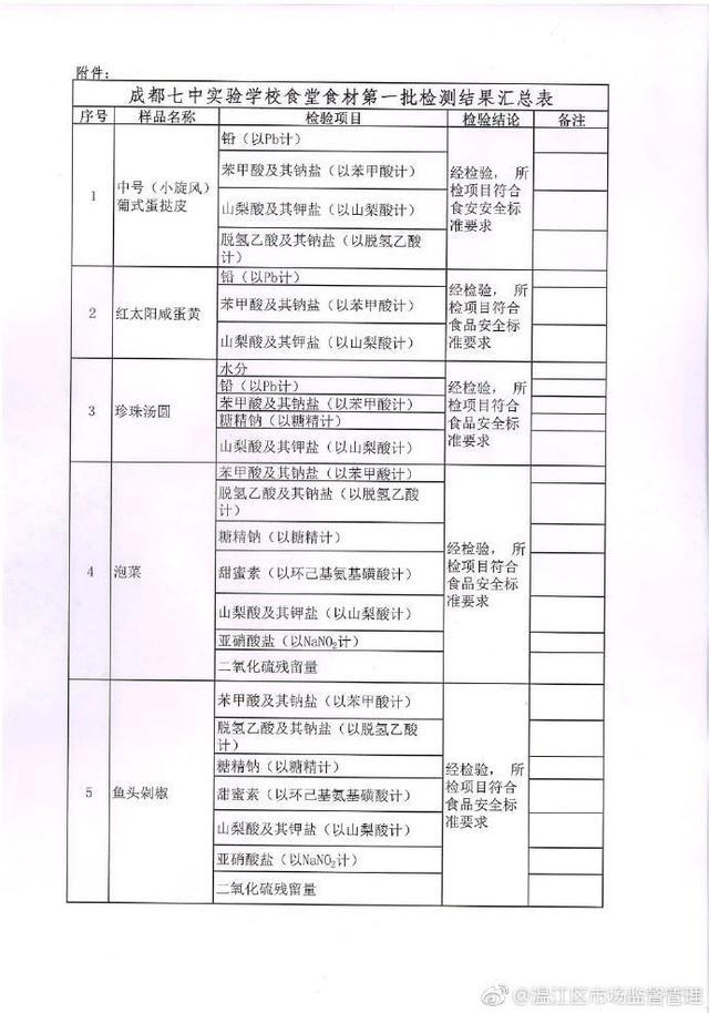成都七中實驗學(xué)校食堂食材第一批檢測結(jié)果匯總表↓↓↓